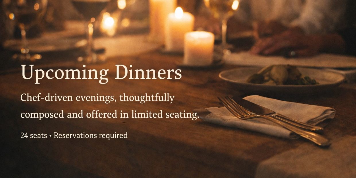 Each dinner is offered in limited seating and designed to unfold naturally — guided by the menu, the room, and the people at the table.